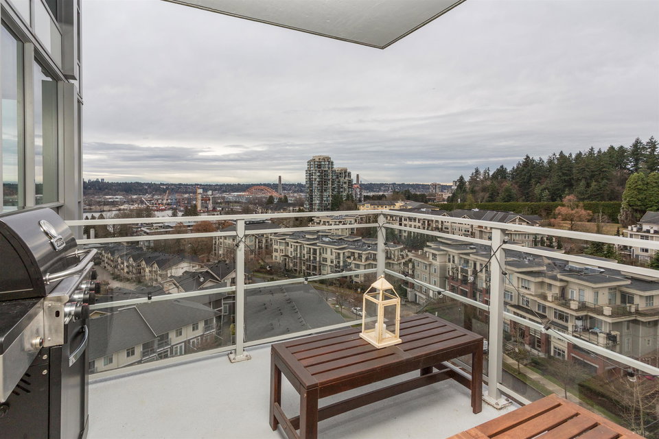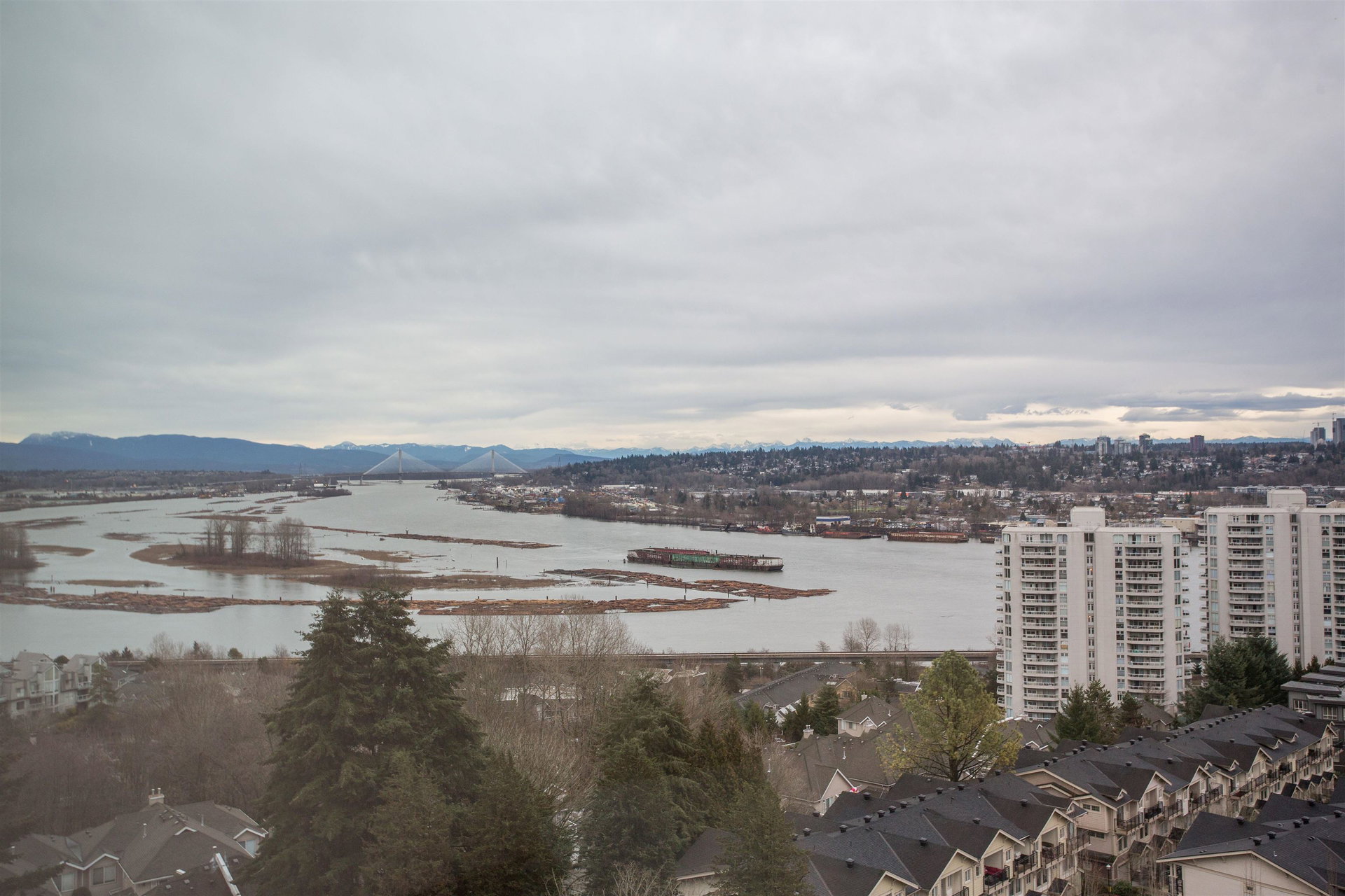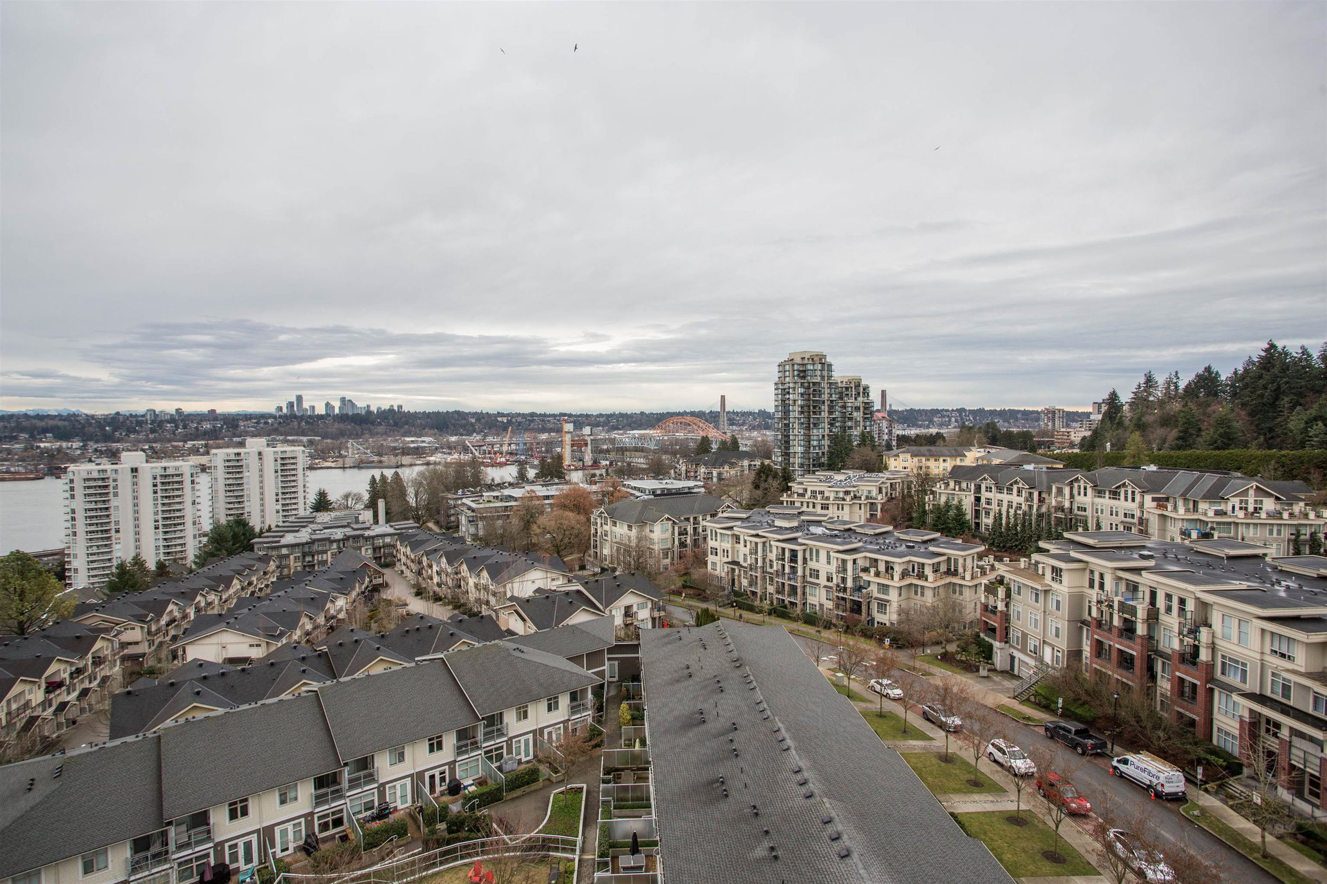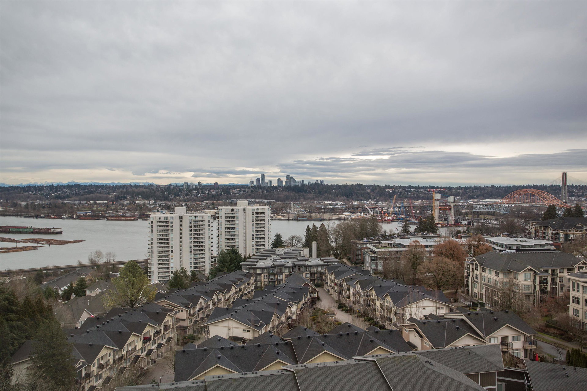 THIS ONE HAS IT ALL! An 05 unit, rarely available 2 bedroom and Den. 180 degree panoramic views of New Westminster, Mt. Baker, The Fraser River & Queens Park, through floor to ceiling windows. Gourmet kitchen with a gas cooktop, soft close cabinetry & quartz countertops. Large master with walk-in closet & organizers. Two full bathrooms. Comes with 2 parking spots and a large, external storage locker & large in-suite storage room. EV Charging now available. Resort-like amenity package including an outdoor pool, hot tub, fitness centre, yoga room, theatre room, games room, workshops, bicycle lockers, guest suites, concierge at front desk, community gardens, walking trails. Open House Saturday February 11th 1:30-2:30pm.