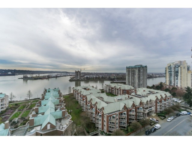 Spacious, SW facing, high quality 1 bedroom + Den with spectacular view of water from living room & bedroom. Large kitchen & patio. Brand new appliances. Excellent Rec facilities: Pool, Sauna, gym, guest suite & party room. Walk to Quay and Skytrain. Open House March 5 & 6 from 1-3pm.