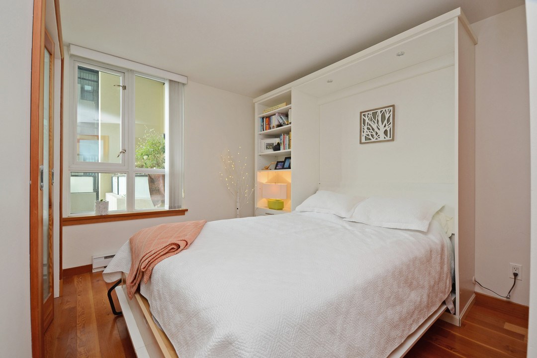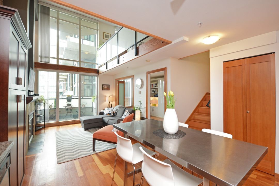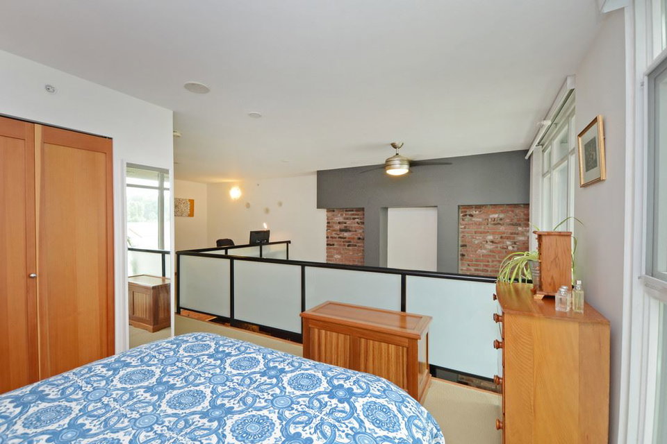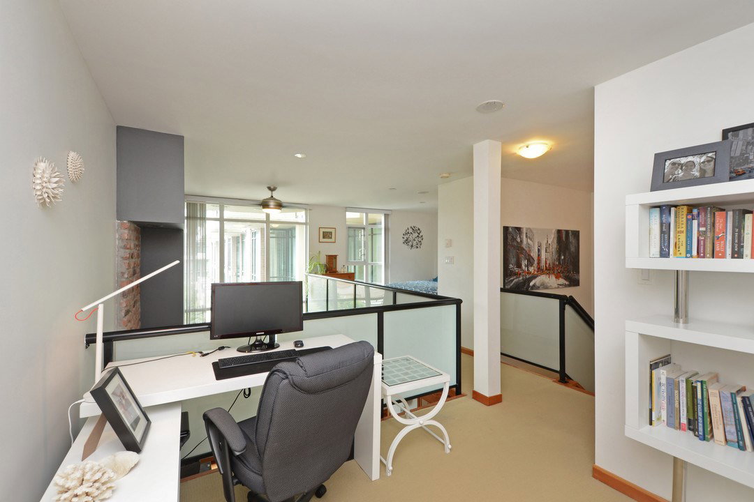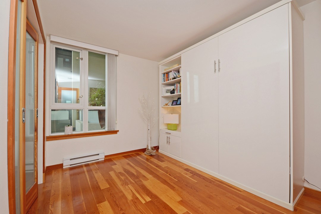 Unique, functional, flexible and full of Westcoast style. Quiet courtyard view at the ever appealing Murano Lofts. Unique layout that offers 2 bedrooms, a very large den and 2 full bathrooms. Murphy bed in second bedroom is included and provides the ultimate in flexibility. Create an open and bright main floor with the bed up and doors open or close them when a little privacy is required. 17′ ceilings let the light shine in and show off the brick feature wall, solid fir floors, extensive fir trim and matching fir doors. Show it off with minimalist decorating and make it look amazing!