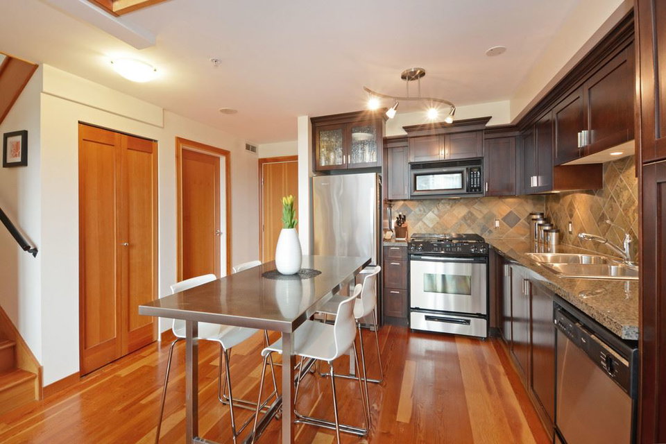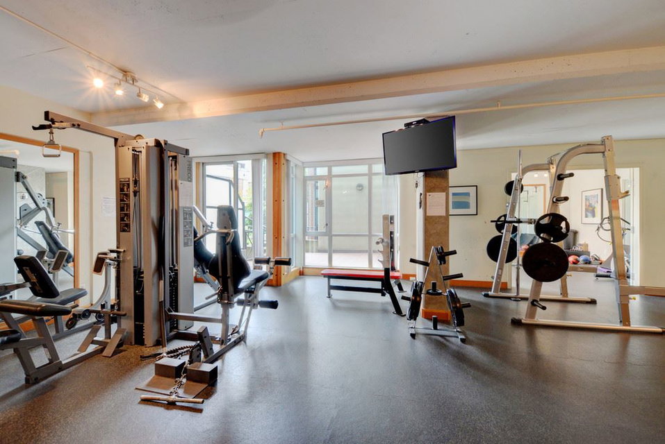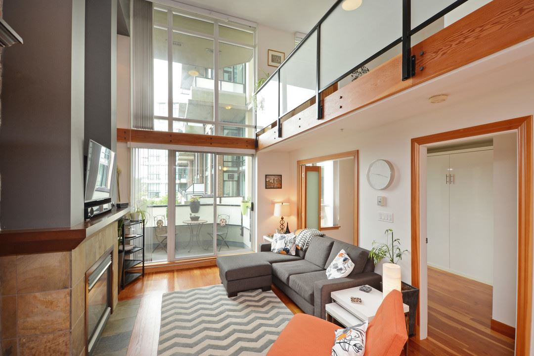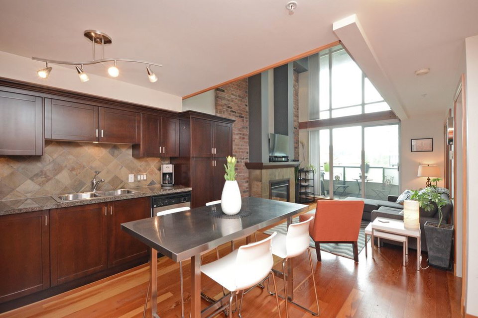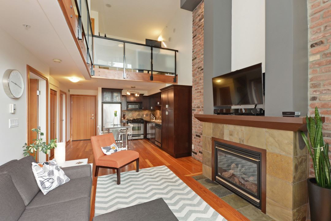 Unique, functional, flexible and full of Westcoast style. Quiet courtyard view at the ever appealing Murano Lofts. Unique layout that offers 2 bedrooms, a very large den and 2 full bathrooms. Murphy bed in second bedroom is included and provides the ultimate in flexibility. Create an open and bright main floor with the bed up and doors open or close them when a little privacy is required. 17′ ceilings let the light shine in and show off the brick feature wall, solid fir floors, extensive fir trim and matching fir doors. Show it off with minimalist decorating and make it look amazing!